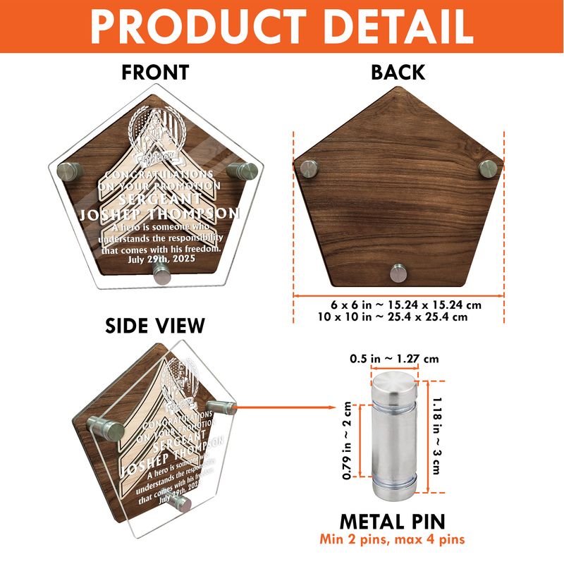 Crafted from premium wood and clear acrylic, this plaque features a wooden back panel (5mm), an additional decorative wooden layer (3mm), and a sleek transparent acrylic front panel (3mm). Sturdy metal pins securely connect each layer, creating a refined and durable construction. - Sizes and Dimensions: